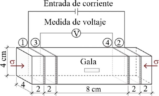 Los electrodos así fijados constituyen las conexiones eléctricas para la aplicación de una corriente eléctrica predefinida entre los puntos exteriores ① y ② al tiempo que se registra la diferencia de potencial medida entre los puntos interiores ③ y ④. La corriente eléctrica fue aplicada mediante una fuente digital Keithley 6220, de National Instruments Inc. La diferencia de potencial se midió con un multímetro digital Keithley 2002, de National Instruments Inc. Las galgas extensométricas de 10 mm (modelo 10/120 CLY41-4L-3M, suministrada por HBM) se utilizaron para registrar las deformaciones producidas tanto por las tensiones como por el incremento de temperatura producido durante el ensayo.