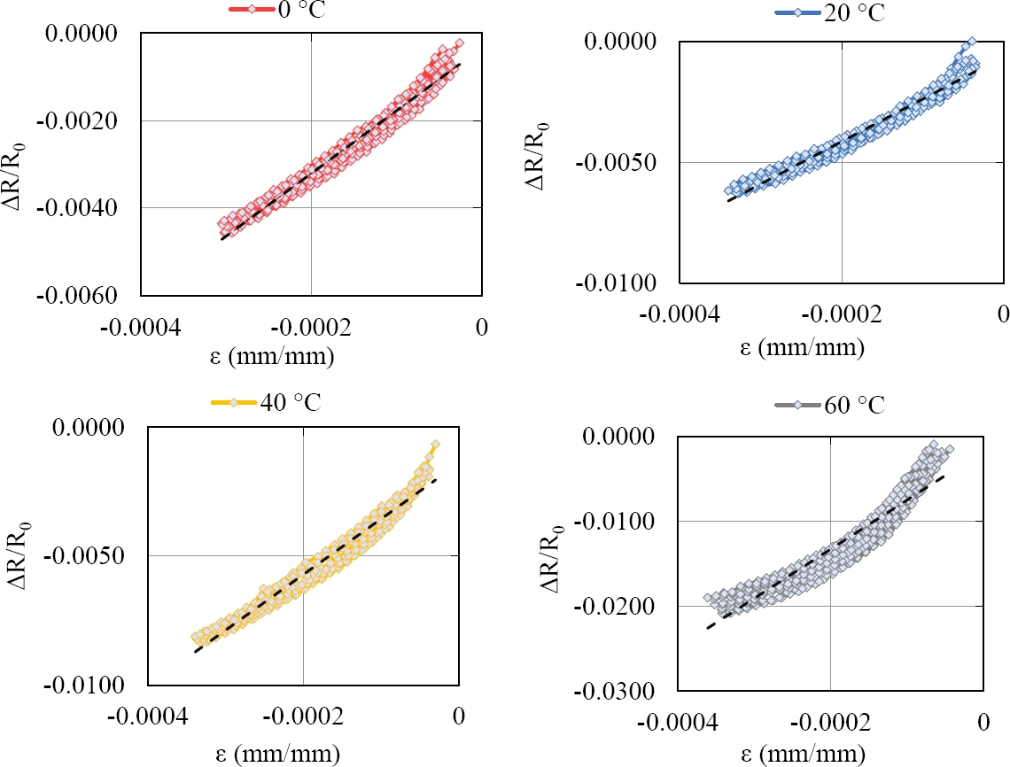 Tabla 1. Efecto de la temperatura sobre diferentes parámetros electromecánicos durante los ensayos de percepción de la deformación: resistividad eléctrica, módulo elástico, factor de galga y coeficiente R2 de Pearson de la regresión lineal. Hubo un ligero aumento de resistividad con la temperatura, de 43.7 Ohm·cm a 0 °C a 45.7 Ohm·cm a 60 °C. En otro trabajo, tampoco se reportaron cambios significativos en la conductividad en el intervalo comprendido entre 50 y 115 °C (Demircilioğlu et al., 2019). Por otro lado, la respuesta mecánica fue similar en todos los ensayos, con módulos elásticos entre 23 y 26 GPa (descartando cualquier daño estructural durante los procesos de carga o calentamiento) (del Moral et al., 2021). Sin embargo, hubo cambios severos en la respuesta piezorresistiva (véase Figura 4) y el factor de galga (FG) a 60 °C fue cuatro veces el FG a 0 °C. Se observó una clara tendencia creciente en el FG al calentar, especialmente en el último nivel de temperatura. No se tomó ninguna medida específica para evitar el intercambio de humedad entre las muestras y el medio ambiente. En la Figura 4 se muestran gráficamente los factores de galga en las diferentes temperaturas ensayadas. Figura 4. Respuesta piezorresistiva de la pasta de 1% NTC y 5% ABG1010 a diferentes temperaturas: 0 °C, 20 °C, 40 °C y 60 °C. Se representan los cambios de resistencia eléctrica frente a su deformación para obtener el factor de galga.