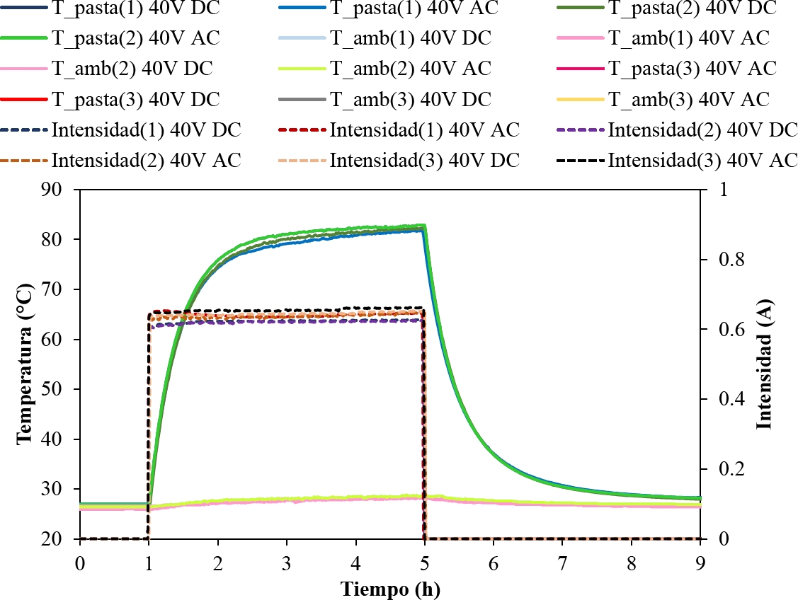 La Figura 6 muestra la temperatura de seis ensayos de calefacción con tres muestras diferentes de amasadas diferentes con el mismo voltaje (40 V) en DC y AC. Como se puede observar, los resultados son muy similares, lo que confirma la reproducibilidad (mismo comportamiento de diferentes muestras a la misma prueba).