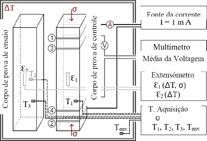 Os eletrodos assim fixados constituem as conexões elétricas para a aplicação de uma corrente elétrica predefinida entre os pontos exteriores ① e ②, ao mesmo tempo em que se registra a diferença de potencial medida entre os pontos interiores ③ e ④. A corrente elétrica foi aplicada por meio de uma fonte digital Keithley 6220, da National Instruments Inc. A diferença de potencial foi medida com um multímetro digital Keithley 2002, da National Instruments Inc. Extensômetros de 10 mm (modelo 10/120 CLY41-4L-3M, fornecidos pela HBM) foram utilizados para registrar as deformações causadas tanto pelas tensões quanto pelo incremento de temperatura durante o ensaio.