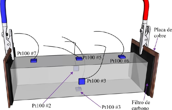 As mudanças de temperatura na superfície das amostras foram registradas continuamente por meio de 6 sensores de temperatura de resistência do tipo Pt-100 conectados a um registrador de dados, e outros dois sensores Pt-100 foram colocados para monitorar a temperatura ambiente. Os ensaios de aquecimento foram realizados aplicando diferentes voltagens. Quanto maior a voltagem aplicada, mais alta foi a temperatura registrada. Foram aplicadas diferentes voltagens com uma fonte de alimentação contínua (DC) e uma fonte de alimentação alternada F5V (AC, a 50 Hz). Em ambos os casos, a corrente elétrica foi medida com multímetros digitais Keithley 2002.