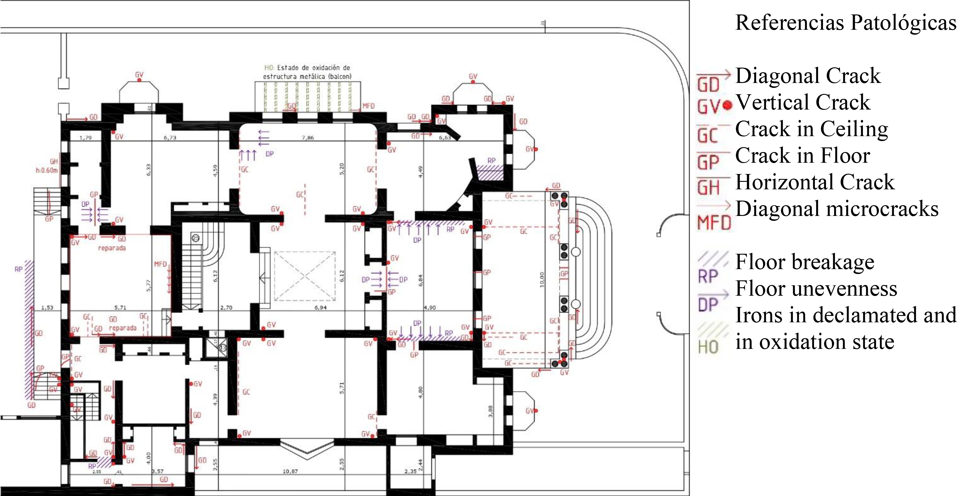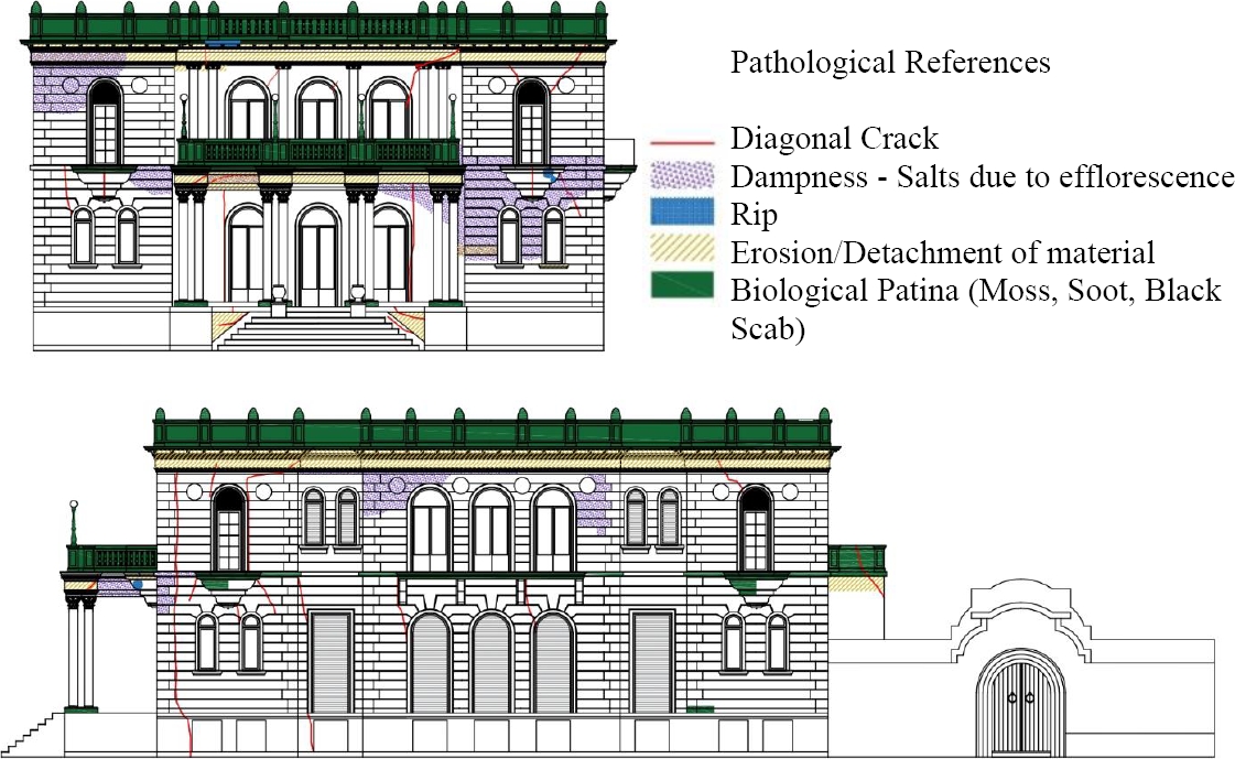 Figures 2 to 4 present diagrams, in plan and façade, of the pathological surveys carried out. The study and analysis allows us to infer the causes that probably originated them. Figure 5 shows a photographic survey of the palace's degrades.