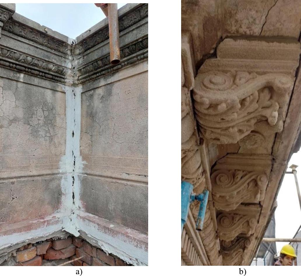 Figure 8. a) Disconnection of walls at corner encounters, due to differential displacements and collapses between them. b) Detail of detachment of ornaments and volutes due to deformation of the cornices, as a result of the settlements. Such loose elements pose a risk of falling into the void.