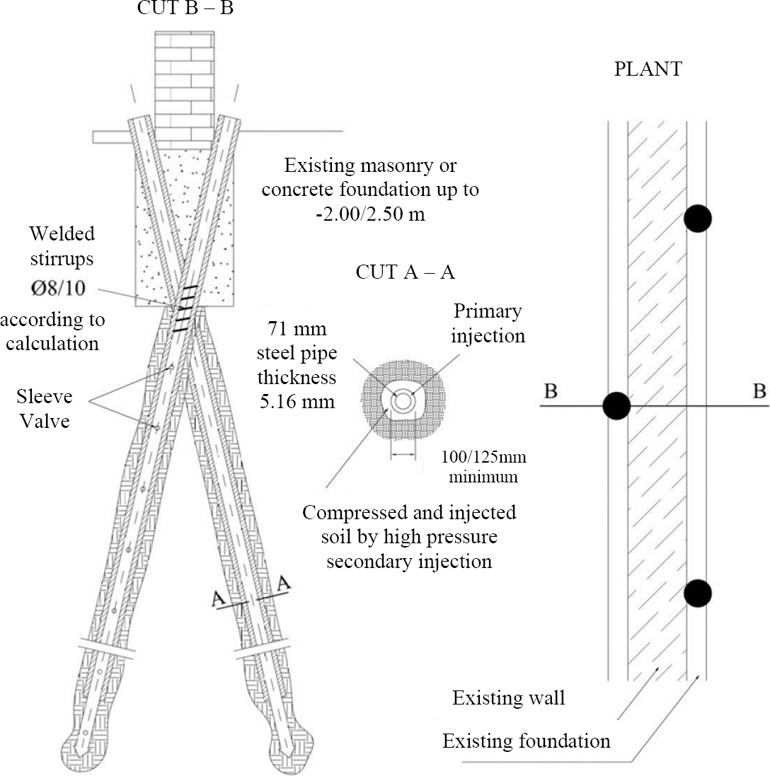 Its load capacity depends on the diameter of the tube used and the type and pressure of injection, and there is the possibility of executing variable selective repetitive injections (IRS) at each depth, when heterogeneous strata are crossed, in which case seals are placed that limit the injection only to the preset layer. In this way, high load-bearing capacities can be achieved, while also avoiding the execution of transfer elements such as wall beams.