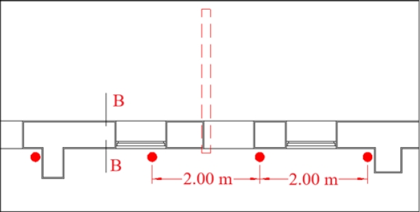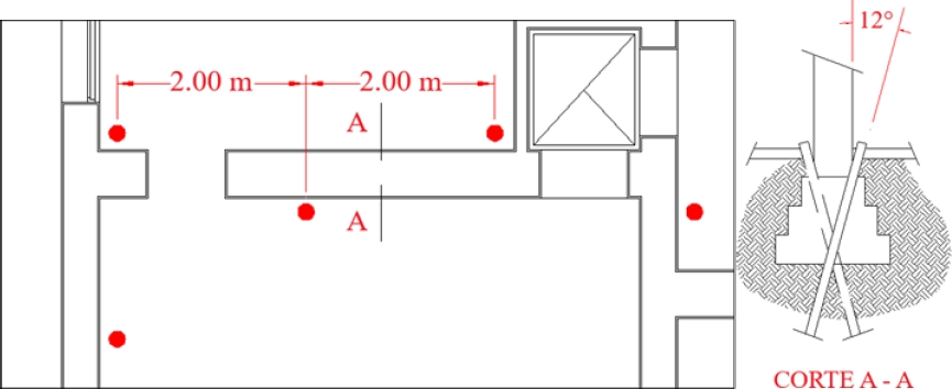 Figure 14. Detail of the arrangement and separation of micropiles in exterior walls, with the tentative location of the passive balance anchors.