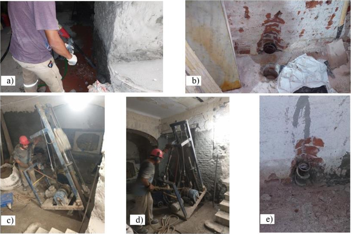Figure 16. Detail of the intervention procedure. a) Image of diamond crown drilling. b) Photograph of the holes drilled in the masonry up to the pre-existing floor horizon. c) Photograph taken during the mechanical driving process of the micropile. (d) Photograph taken during the driving of a micropile. e) Image of the upper end of the Manessmann tube, driven, with welded abutments to increase the frictional surface against the sub-pressure slab to be executed.