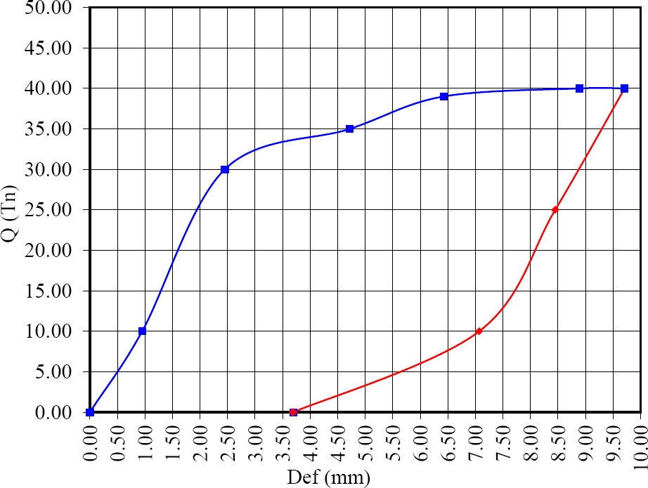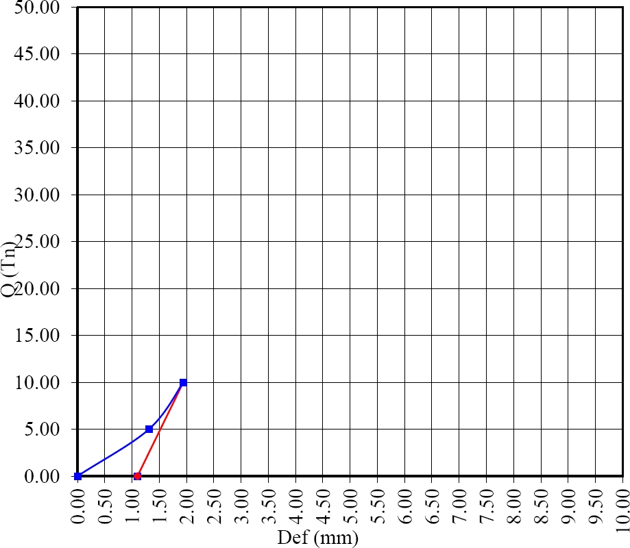 Every 10 tons, the system is unloaded and residual strain readings are taken, which is the parameter to be checked, before starting a new loading cycle. The final deformation must not exceed 10% of the pile diameter (125 mm), i.e. the maximum permissible residual deformation cannot be greater than 12.5 mm, for the requested service load of 20 tons.
