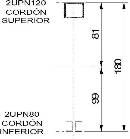 Considering the dimensions and analysis of the requests, the upper cord was premeasured with two profiles UPN 120 making a drawer-like section with an área of 27 cm2, and the inferior cord was premeasured with two matched UNP 100 profiles with an area of 22 cm2 (figure 7).