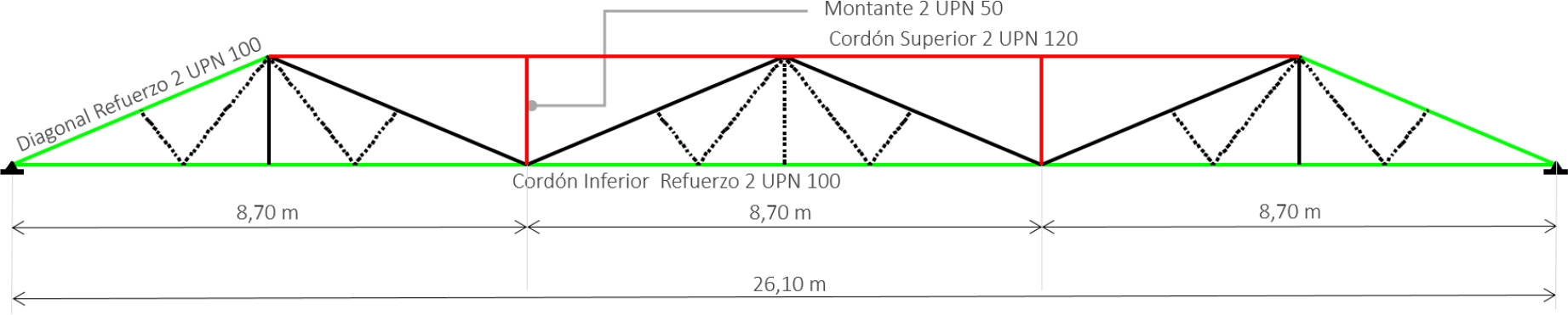 Por otra parte, se reforzaron tanto el cordón inferior como algunas de las diagonales existentes más solicitadas a los fines de resistir los esfuerzos internos de tracción y compresión a partir de la evaluación del nuevo comportamiento estructural.