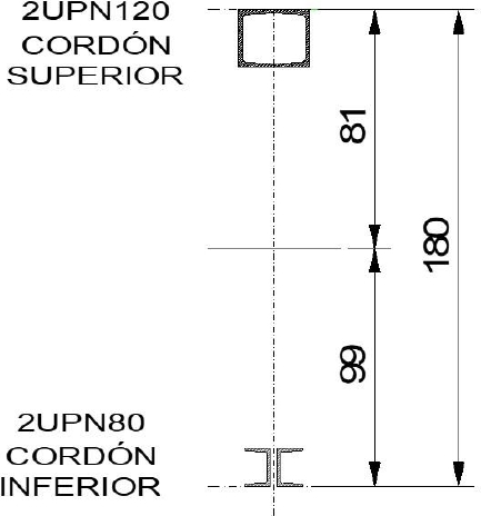 Devido às dimensões e à análise das solicitações, o cordão superior foi pré-dimensionado com dois perfis UPN 120 formando uma seção caixa com uma área de 27 cm2, enquanto o cordão inferior foi composto por dois perfis UNP 100 emparelhados, com uma área de 22 cm2 (figura 7). A partir da análise dos parâmetros que influenciam a determinação da flecha máxima, foram estabelecidos os seguintes dados: