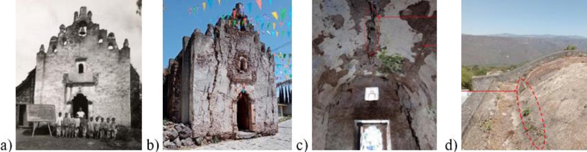 Figura 2. Templo de la Santa Catarina; a) edificio conservado (Biblioteca Tomás Navarro Tomás, 2023); b) estado actual del templo; c) y d) grietas en la clave y los riñones, respectivamente. Tomado de (Segovia, M. A., 2022).