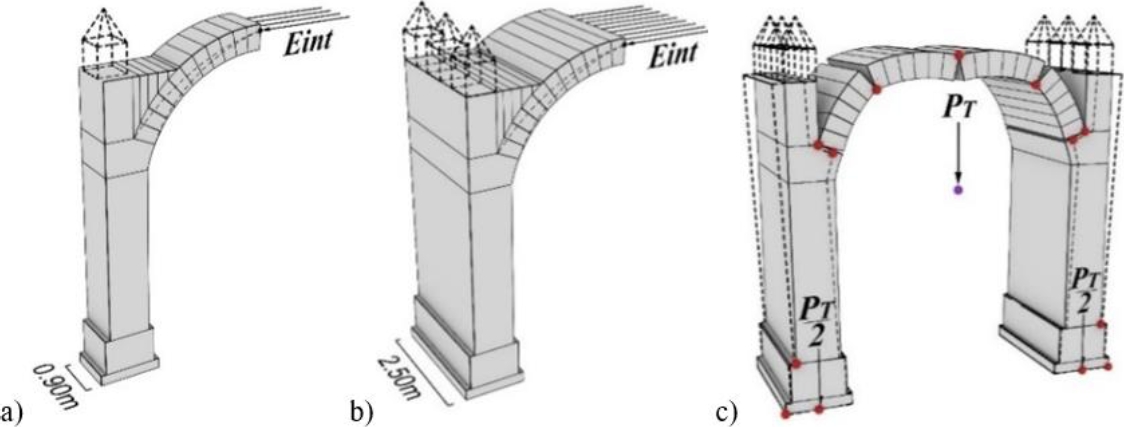 Figura 4. Vista en 3D de las franjas Fr (subsistemas) seleccionadas para el análisis, a) subsistema Fr1 de 0.90 m, b) subsistema Fr2 de 2.50 m de ancho, c) representación de la formación de bisagras en puntos específicos análogos a los del objeto patrimonial real (ver figura 3). Dimensiones en metros.