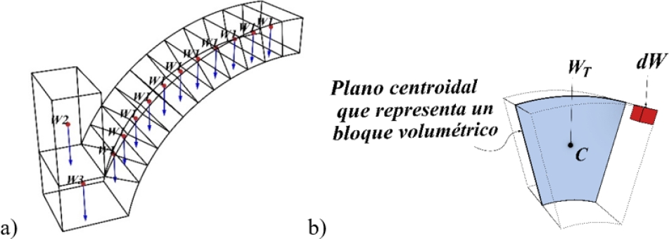 Figura 5. Centros de gravedad de los bloques que forman el sistema, a) fuerzas gravitacionales (W) concentradas en los elementos estructurales discretizados, b) peso total (WT) y peso diferencial (dW) de cada elemento atomizado, donde: C = Centro de gravedad.