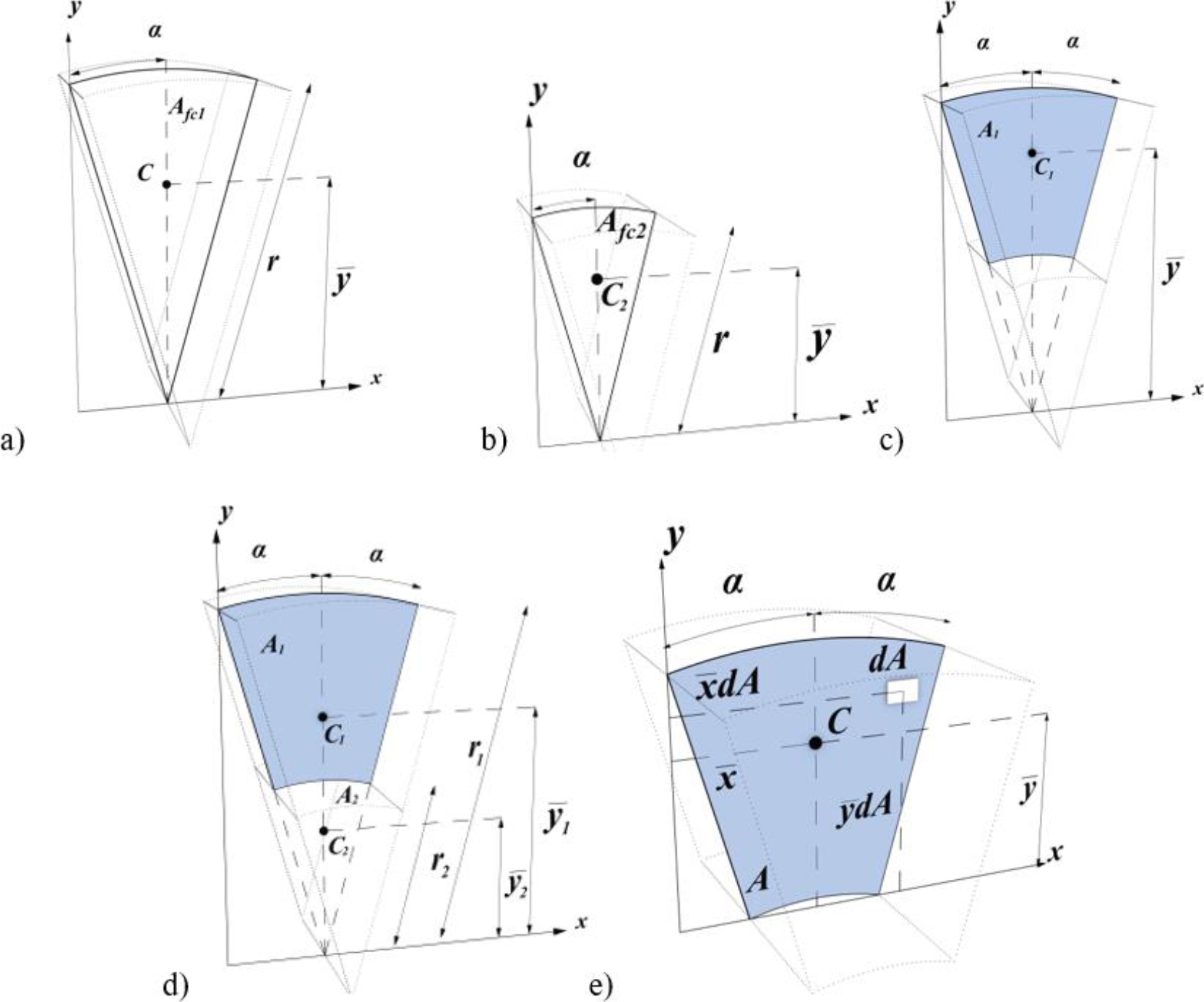 En la figura 6, Afc= Área de la forma cónica, C1= Centro de gravedad de A1, C2= Centro de gravedad de A2, A1= Área que queda después de restar, A2= Área que se resta, α= Ángulo de apertura (en grados) del sector circular al eje centroidal, g= generatriz cónica, 1= Distancia del eje “x” al centroide de A1, 2= Distancia del eje “x” al centroide de A2, A= Área resultante, C= Centro de gravedad de A, dA= Área parcial, r= radio, El ángulo α se afecta por (π/180) para convertir a radianes.