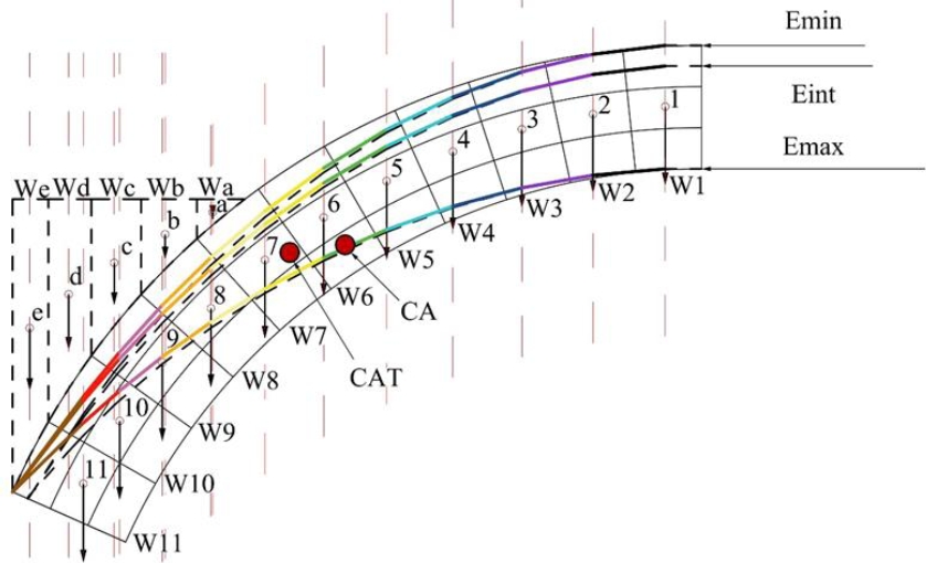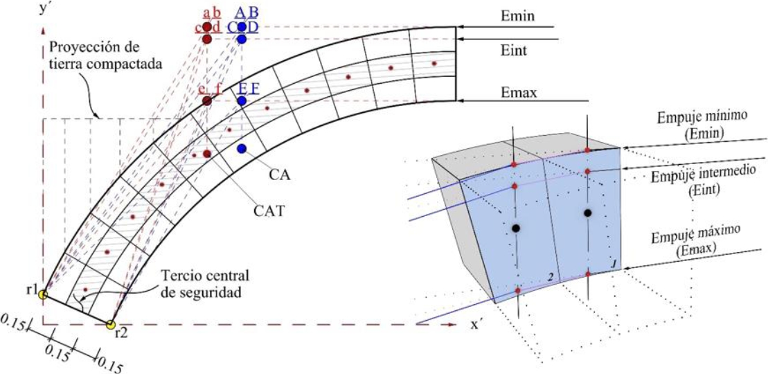 En la figura 8, Emin= Empuje mínimo, Eint= Empuje intermedio, Emax= Empuje máximo, r1-r2: puntos de rotación. Nodos (a)-(f): intersecciones entre la línea vertical que pasa por el centroide del subsistema de arco de tierra compactada y los empujes vectoriales. Nodos (A)-(F): intersecciones entre la línea vertical que pasa por el centroide del subsistema arco sin tierra y los empujes vectoriales. CA y CAT: centros de gravedad de los subsistemas arco sin tierra y tierra compactada, respectivamente. Teoría tomada de (Barlow, William Henry 1846; Meli, R. 1998).
