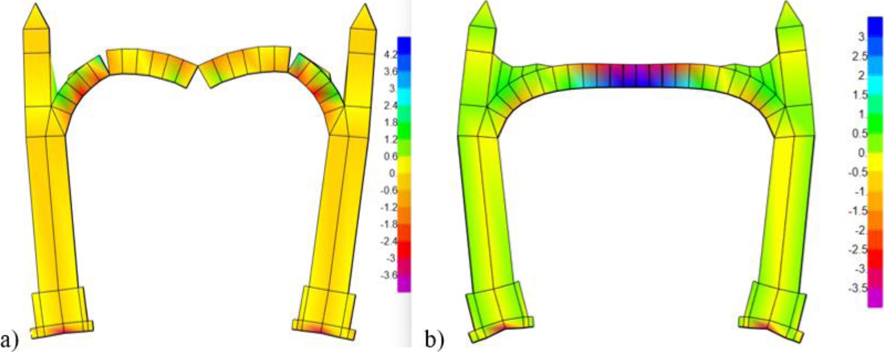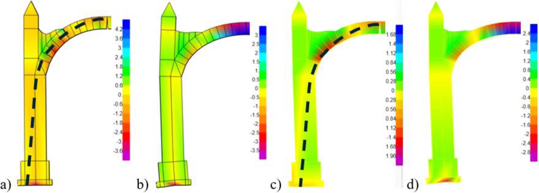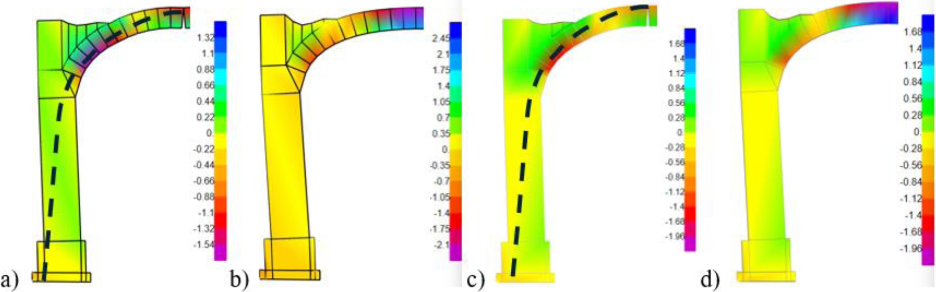 Al comparar los resultados del análisis gráfico con los obtenidos de los análisis con elementos finitos, se observa que el comportamiento estructural tiende a ser similar, pero con algunas particularidades, los muros tienden a girar hacia el exterior y la bóveda es propensa a bajar, donde la parte superior de la clave se desplaza hacia abajo por efectos gravitacionales. En los elementos modelados como discontinuos, el intradós de la clave tiende a tensarse y como la mampostería tiene muy poca resistencia a tracción, prácticamente nula, aunque sean dovelas, esa zona se abre provocando un giro en la zona o punto de contacto superior y genera así lo que en métodos gráficos se denomina empuje horizontal mínimo (Emin). Los resultados que más se asemejan al método gráfico son los modelos con elementos tipo cáscara (shell) donde la discontinuidad se considera tal y como se presenta en el objeto real. Por ejemplo: al comparar las fuerzas calculadas con el método estático gráfico en el caso donde se consideró discontinuidad, carga de tierra por encima de la bóveda y pináculo, se obtuvo un empuje horizontal mínimo de 2268.62kg (ver tabla 4), y en el mismo caso modelado con elementos finitos, se obtuvo un esfuerzo en la misma zona de 0. 33kg/cm2, por lo tanto, al convertirlo en fuerza, se obtiene un empuje horizontal de 2970kg (ver figura 12a), por lo tanto, el Emin calculado con métodos gráficos, para este caso en particular, tuvo una diferencia de 24% menos en magnitud que el calculado con elementos finitos, esto se debe a la redistribución de elementos mecánicos y fuerzas, debido a la continuidad de los sistemas basados en elementos tipo cascara o sólidos. Por otro lado, para determinar la línea de empuje en los modelos de elementos finitos, se seleccionó cada delta de superficie de cada elemento cascara modelado para encontrar la compresión que representa la línea de empuje con el fin de graficarla.