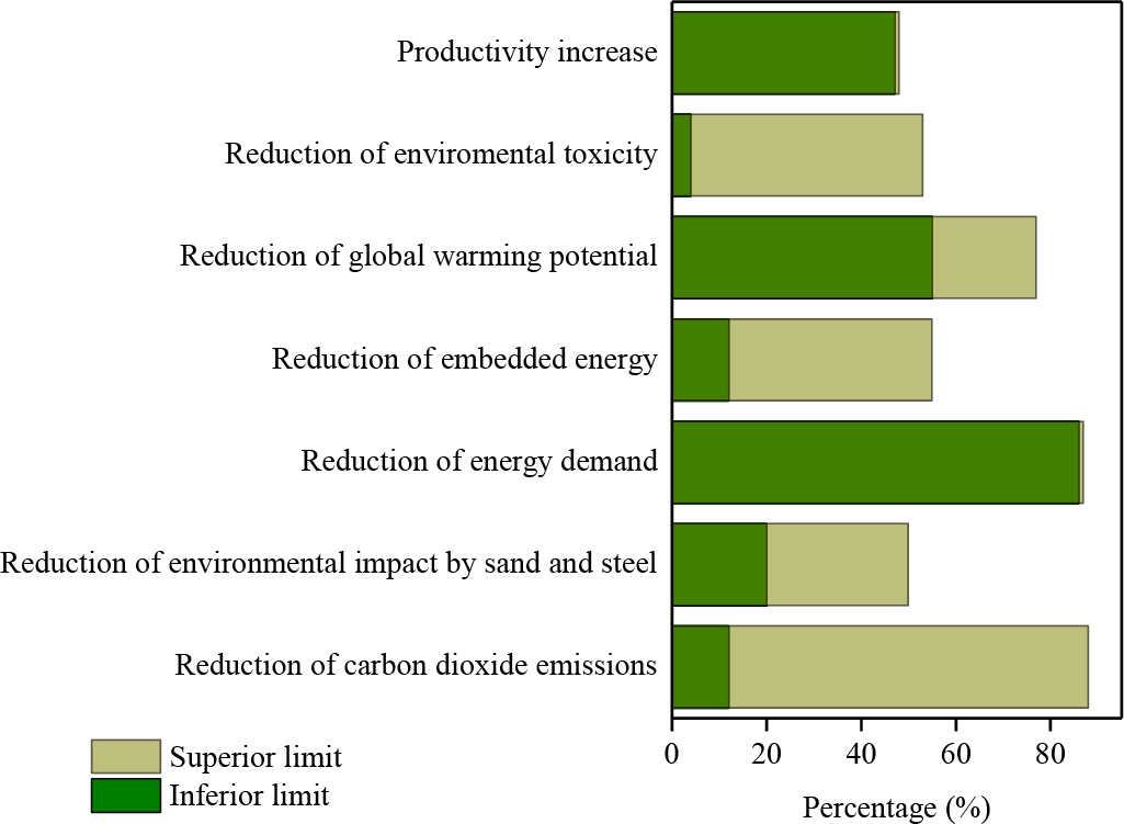 Figure 1. Ventajas en los aspectos del impacto ambiental de la impresión 3D de materiales cementantes con respecto del concreto convencional (adaptado de Motalebi y col., 2023).