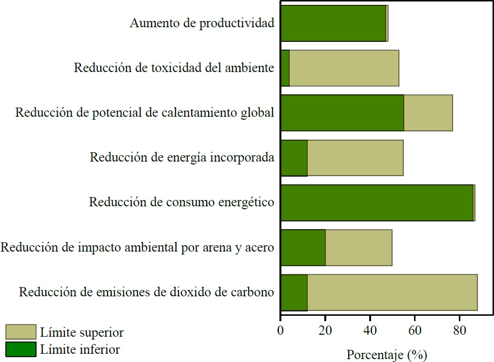 Figura 1. Ventajas en los aspectos del impacto ambiental de la impresión 3D de materiales cementantes con respecto del concreto convencional (adaptado de Motalebi y col., 2023).