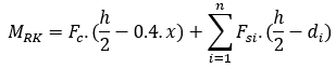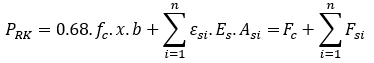 Equation 1 determines maximum compression load applied to the column; Equation 2 determines the bending strength, taking into consideration a uniaxial compression, where: fc is compressive strength; x is the neutral line; b is the section width; ε is the material strain; E is the modulus of elasticity of steel; As is the steel area; h is the section height; F is the force in the layer; d is the effective depth.