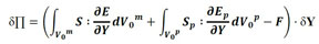 in which Θ is the specific strain energy of the particle elements, ue is the specific strain energy of the matrix elements, F is the vector of conservative external forces, Y is the vector of nodal positions, Ep is the Green-Lagrange strain related to the particle elements, E is the Green-Lagrange strain related to the matrix elements, both evaluated by Equation (2), and V0p e V0m are the initial particle and matrix volumes, respectively.