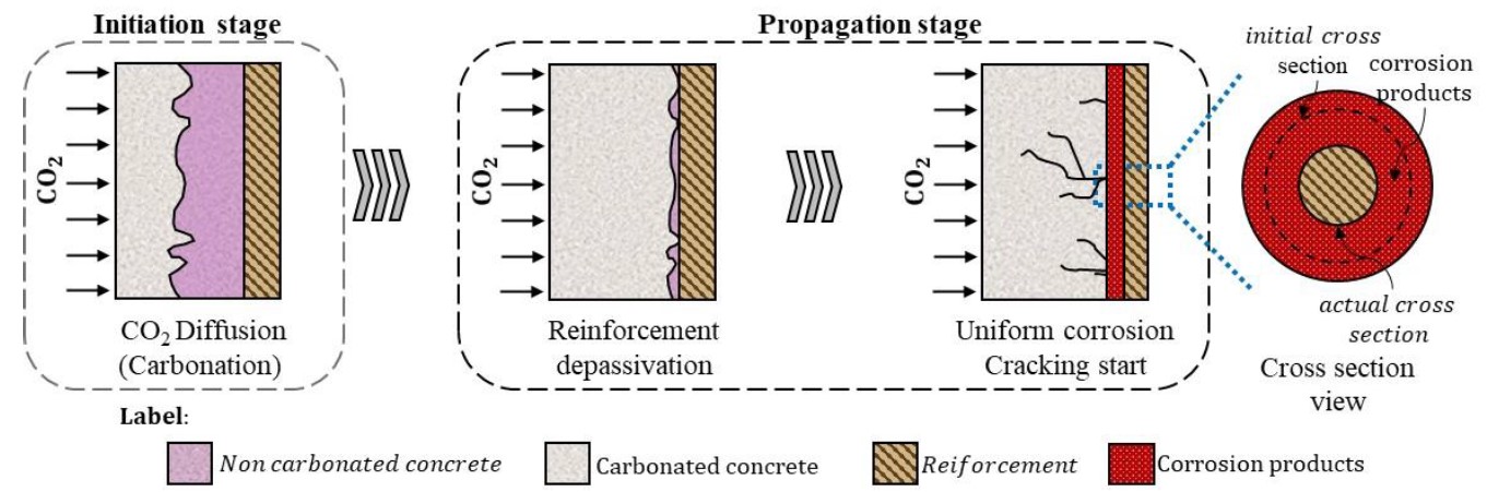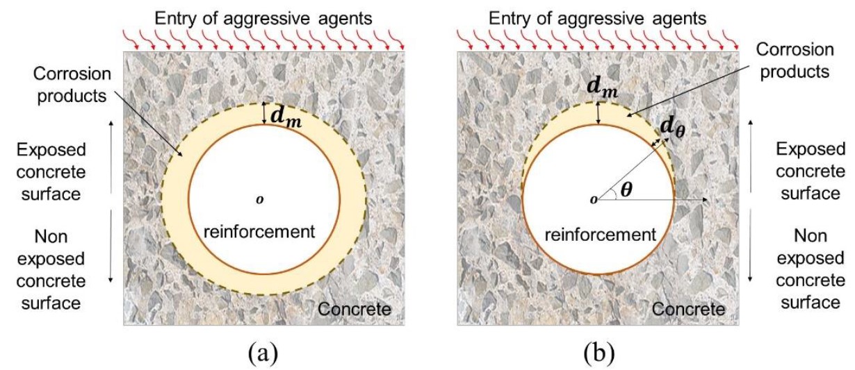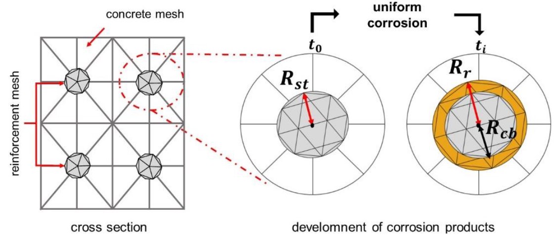 Thus, considering that the carbonation induced corrosion develops uniformly throughout the reinforcement, the model by Kiani and Shodja (2011) is used in this work to represent the corrosion progress.