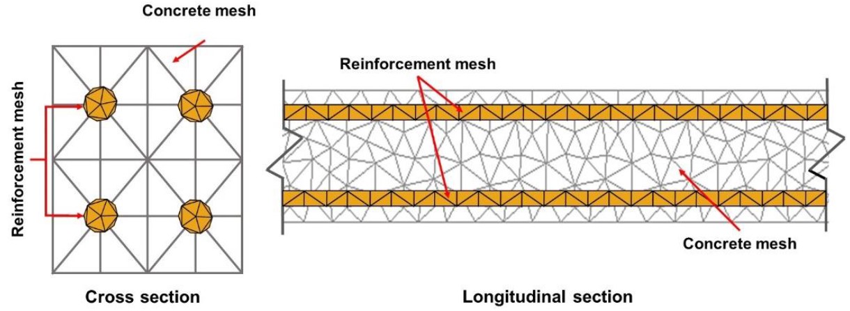 Reinforced concrete is discretized considering the concrete and reinforcement matrix (Figure 2). Both the concrete matrix and the reinforcements are represented by means of flat triangular two-dimensional elements, the reinforcement mesh being coupled to the concrete matrix by means of the drawing technique, described in Vanalli et al. (2008) and Paccola and Coda (2016). In this case, a perfect adhesion between the particle and the matrix occurs, making the use of particle elements do not increase the degrees of freedom of the system. All the degrees of freedom of the particle elements are written based on the elements of the matrix.