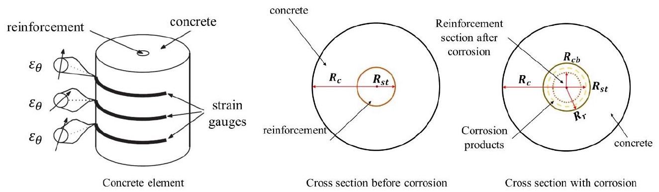 The model by Kiani and Shodja (2011) requires the evaluation of the reduced radius of the reinforcement due to corrosion ( Rcb ) and the radius of the rust front ( Rr ), which can be obtained in (7) and (8) respectively. It is also required to calculate the volume of the produced rust, according to (9), and the volume of consumed steel, according to (10).