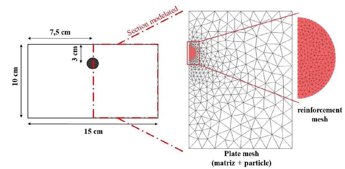 For numerical modeling, only half of the concrete plate was simulated (see Figure 6), due to symmetry of the problem. The plate was discretized by means of a particulate composite element, being used 680 triangular finite elements for the representation of the concrete matrix and 826 triangular finite elements for the discretization of the reinforcement.