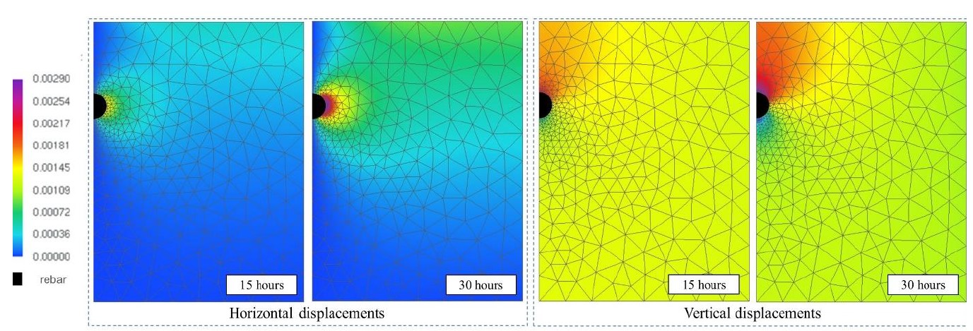 Figure 8 shows the horizontal and vertical displacements of the concrete slab after 15 and 30 hours of accelerated corrosion. One may notice that, only after 30 hours, significant deformations are observed on the surface.