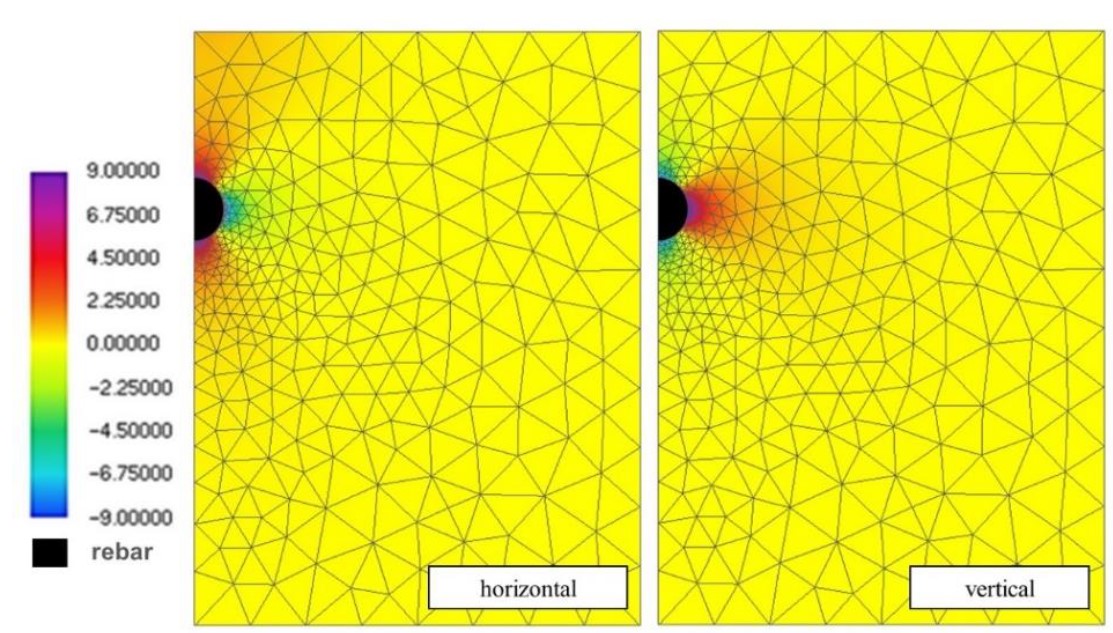 Figure 9 shows the stress distribution in the horizontal and vertical directions after 30 hours of accelerated corrosion. As expected, it is possible to observe that the tensile stresses present values above 3 MPa, corresponding to the tensile strength of the concrete, which would imply the development of cracks and corroborating the conclusions of Nguyen et al. (2007).