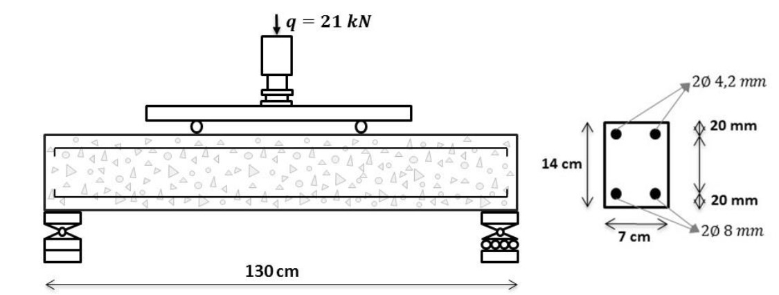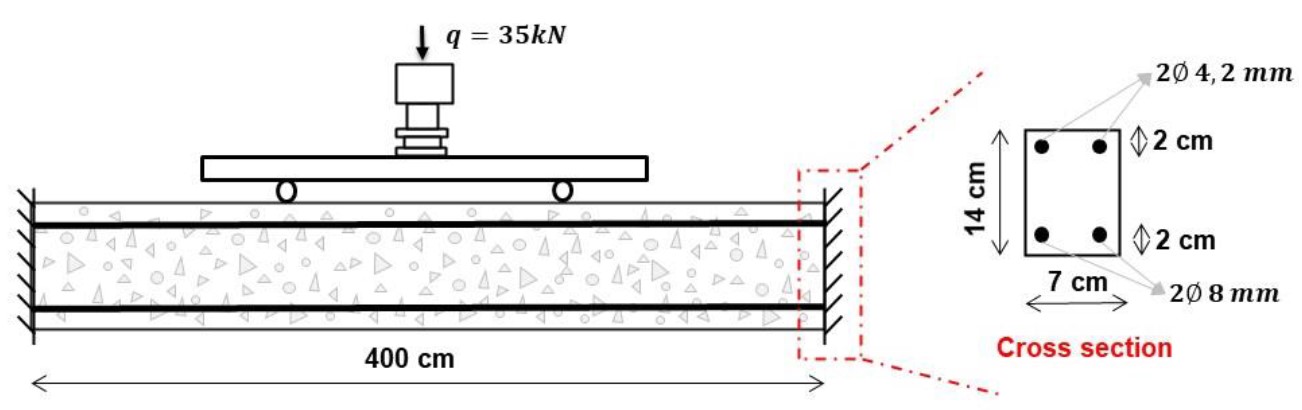 In the second example, a reinforced concrete beam is simulated, based in the experimental assessment of Graeff (2007), see Figure 10. The simply supported beam of length 130 cm has a rectangular cross section 7 cm wide and 14 cm high, with a span of 120 cm between supports, see Figure 10 for more details.