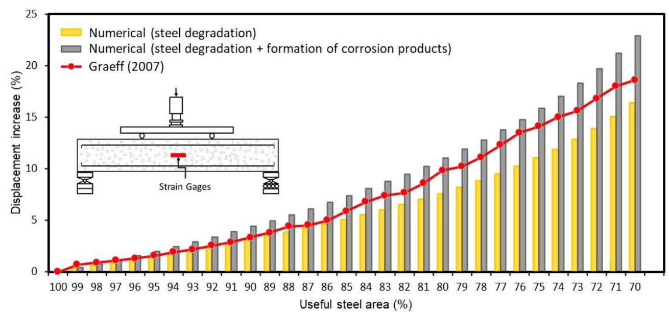 In this work, the simulation of corrosion was done considering two situations, one in which the effects of corrosion are related only to the loss of the steel section, and another in which the corrosion causes the loss of the steel section and the expansion of the concrete, due to the formation of corrosion products. By means of Figure 11, the results achieved with this work are compared with those determined in Graeff (2007). It can be seen from Figure 11 that the difference between the results obtained by the numerical model presented in this work (in the two simulations) and those obtained by Graeff (2007) is increasing, as the degradation of the reinforcements increases. An explanation for such a difference is because Graeff (2007) adopted in his model a nonlinear constitutive law for concrete and steel.