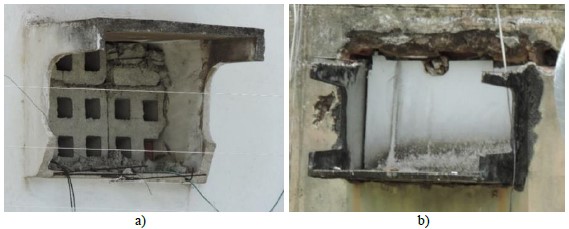 | Figura 12. Corrosão da armadura em modelo tipo janela: a) fissuras; b) destacamento do concreto | ||||