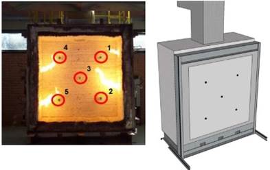 La prueba se realizó en el Laboratorio de Seguridad contra Incendios de Unisinos. La pared se probó después de 56 días de curado en un horno vertical. El horno tiene cuatro quemadores dispuestos de acuerdo con la Figura 4, controlados por dos termopares que permiten medir la evolución de la temperatura según ISO 834 (2014). La Figura 4 también muestra la secuencia de montaje e instalación en la pared en el horno de prueba. El horno tiene una chimenea que regula el flujo de los gases generados por el calentamiento y la presión interna durante todo el ensayo, aislamiento térmico compuesto por una manta fibrocerámica y cuatro quemadores de gas, controlados digitalmente por un centro de control digital.