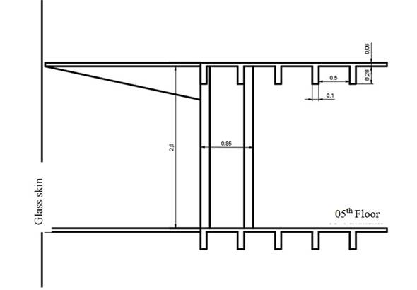 The building slabs were ribbed and were placed in situ with thickness of the topping slab of 6 cm (Figure 7). The ribs were 10 cm width and 28 cm high to the bottom of the topping slab, and were spaced every 50 cm. From the columns to the limit where it was installed the glass skin, the slab was a cantilever slab with variable cross-section (Figure 8).