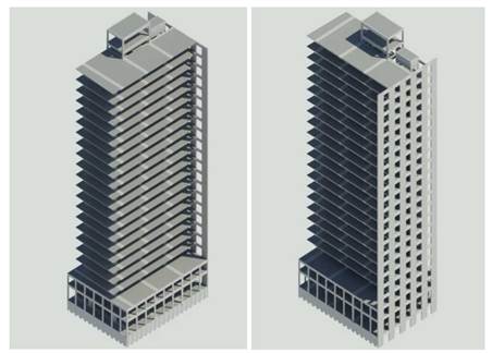 Frontal and posterior perspectives of the structure of Ed. Wilton Paes de Almeida (source: interpretation of existing projects at FAU-USP, SPU and Acrópole Magazine). |