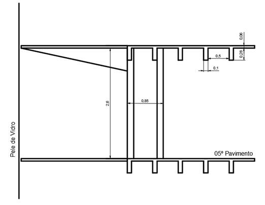 As lajes do edifício eram nervuradas e foram moldadas in loco com espessura da mesa superior de 6 cm (Figura 7). As nervuras tinham 10 cm de largura e 28 cm de altura até o fundo da laje ou mesa superior, e eram espaçadas a cada 50 cm. Dos pilares até o limite onde era instalada a pele de vidro, a laje era em balanço, com seção plena triangular que reduzia em função da distância ao pilar (Figura 8).