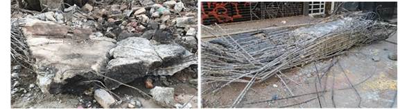 | Figura 10. Trechos de laje em balanço e pilar recolhidos dos escombros para ensaios (fonte: acervo pessoal de Paulo Helene) | ||||