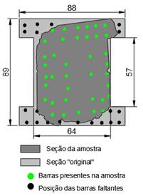 Após o corte diamantado da seção do pilar recolhido dos escombros, ficou evidente a disposição das armaduras dentro do pilar, sendo então possível realizar a reconstituição da seção transversal do trecho de pilar amostrado, conforme apresentado na Figura 11.