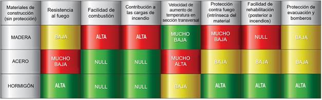 | Figura 1. Atributos de los materiales de construcción (sin protección) bajo fuego (Jacobs, 2007). | ||||