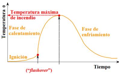 Costa y Silva (2003) y Costa (2008) describen que, en general, la curva representativa de la variación de temperatura en un incendio real se caracteriza por dos ramas bien definidas (una ascendiente y una descendiente) con tres etapas delimitadas por dos puntos (Figura 3) ignición, flashover y temperatura máxima. Estas tres etapas se explican a continuación.