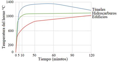 | Figura 4. Curvas "idealizadas" para tres escenarios de simulación de incendios: túneles, hidrocarburos y edificios - materiales celulósicos - hasta 120 minutos (The Concrete Center, 2004). | ||||