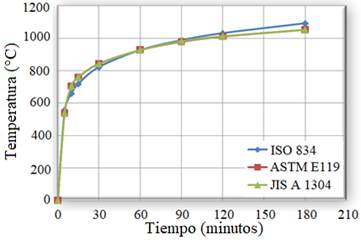 Las tres curvas idealizadas y estandarizadas más utilizadas en el campo técnico y también utilizadas en estudios experimentales que involucran simulaciones de escenarios de incendio causadas por materiales basados en celulosa en elementos de concreto son las curvas: ISO 834, ASTM E119 y JIS A 1304 (Phan, 1996). Estas curvas son muy similares y se pueden ver superpuestas en la Figura 5. Las curvas estándar relacionadas con los túneles y los hidrocarburos no se tratarán en este artículo y se pueden consultar en Leonardo Da Vinci Pilot Project: Handbook 5 (2005).