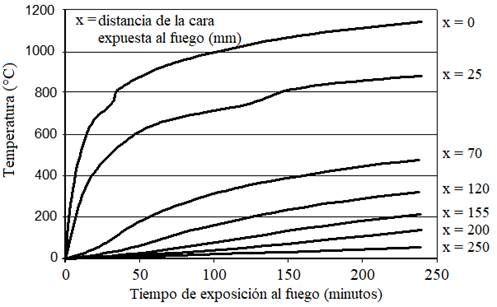 Para ejemplificar el comportamiento de la evolución del campo de temperatura en función del tiempo en un elemento concreto, se presenta el estudio de simulación por ordenador realizada por Ongah, Mendis y Sanjayan (2002) en muros de concreto de alta resistencia (Figura 6) con solo un lado expuesto al fuego. El gráfico indica el gradiente térmico significativo dentro del material (concreto) de acuerdo con un modelo de flujo de calor que simula numéricamente el escenario del incendio.