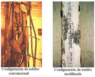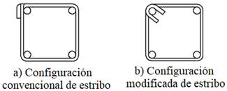 | Figura 12. Configuración de refuerzo de sección transversal convencional (estribos) de un pilar de concreto de alta resistencia (a) y configuración modificada para mejor (b) (Kodur et al., 2005). | ||||