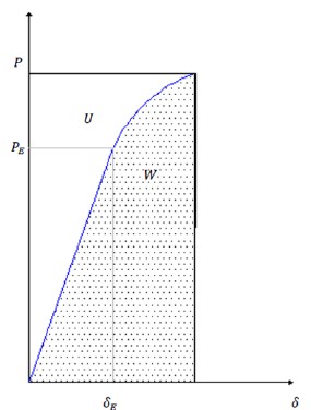 Figure 1 is divided into two regions, a lower one whose area corresponds to the work W that was produced during the loading process and an upper one whose area corresponds to the deformation energy U stored by the structure, which allows it to recover its original shape if the load is removed fully or partially. When the structural mechanical behavior is linear elastic, the work and the deformation energy have the same magnitude, which implies that the structure can recover its original configuration if the loads are removed; if the behavior is non-linear, the values of the work done and the stored deformation energy are different, which implies that, when the load is removed, the structure will partially recover its configuration. Disregarding the energy generated in the form of heat, if the structure has non-linear behavior, the stored deformation energy is less than the work done by the system; This consideration is applicable in reinforced concrete structures.