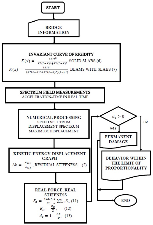 The structural mechanical behavior under service loads depends on the level of efforts achieved and the number of repetitions or load cycles; Factors such as deterioration, corrosion, fatigue and / or an increase in the level of service loads, can generate permanent damage that modify the conditions of its mechanical response. Design considerations for the structural performance is based on elastic linear mechanical behavior and the structure is considered healthy if this behavior is preserved. When the accumulated damage modifies this behavior, non-linear behavior begins where the proportion between the displacements and the applied forces is no longer constant; It is under this basic principle that the proposed method offers information on the present structure state.