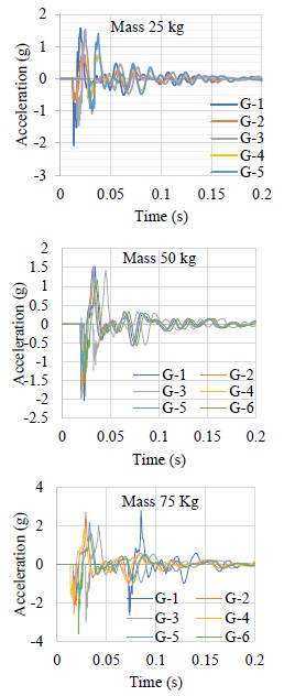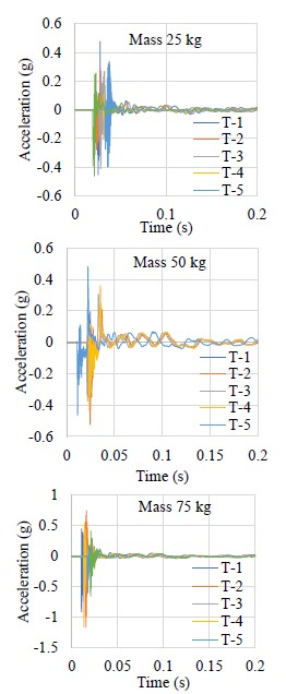 As illustrated in Figure 10, f <F; the null hypothesis is discarded, so the displacements obtained are dependent on the fall heights of the masses with a confidence value of 95%.
