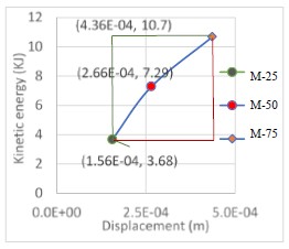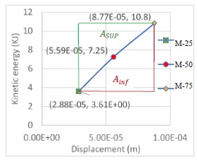 From the the signals’ numerical processing show in Figures 8 and 9, the velocity and displacement spectra were obtained; Knowing the masses´s free fall heights, we proceeded to the construction of the kinetic energy vs. displacement graphs, using (9) to estimate the kinetic energy. Figures 11 and 12 show kinetic energy vs average displacements graphs for the study cases.