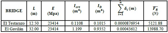 For the bridge “El Testarazo” EI = 2,595 MN - m² (for solid slab stiffness); for the El Gavilan bridge EI = 28,082 MN - m² (for beam stiffness). With these values the stiffness curve was obtained. In both cases, only bending effects are considered. The concrete elasticity modulus value used was E = 23.414 Mpa, based on the expression E = 15100 √(ƒc')(Kg/cm2).